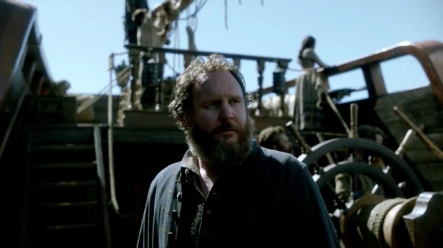 Featherstone is now acting as Charles Vane’s quartermaster, hunting what they think is a Dutch merchantman. As they approach, they see men jumping overboard and Featherstone thinks it's the crew, but Vane realizes that the Dutch Captain is throwing his real cargo-slaves-overboard. He remarks that Jack told them that the ship was carrying timber and other supplies necessary for fort repairs, and neglected to say anything about slaves. Vane puts out longboats for the slaves, but continues his pursuit, eventually capturing the merchantman and killing the captain before returning to Nassau[7].