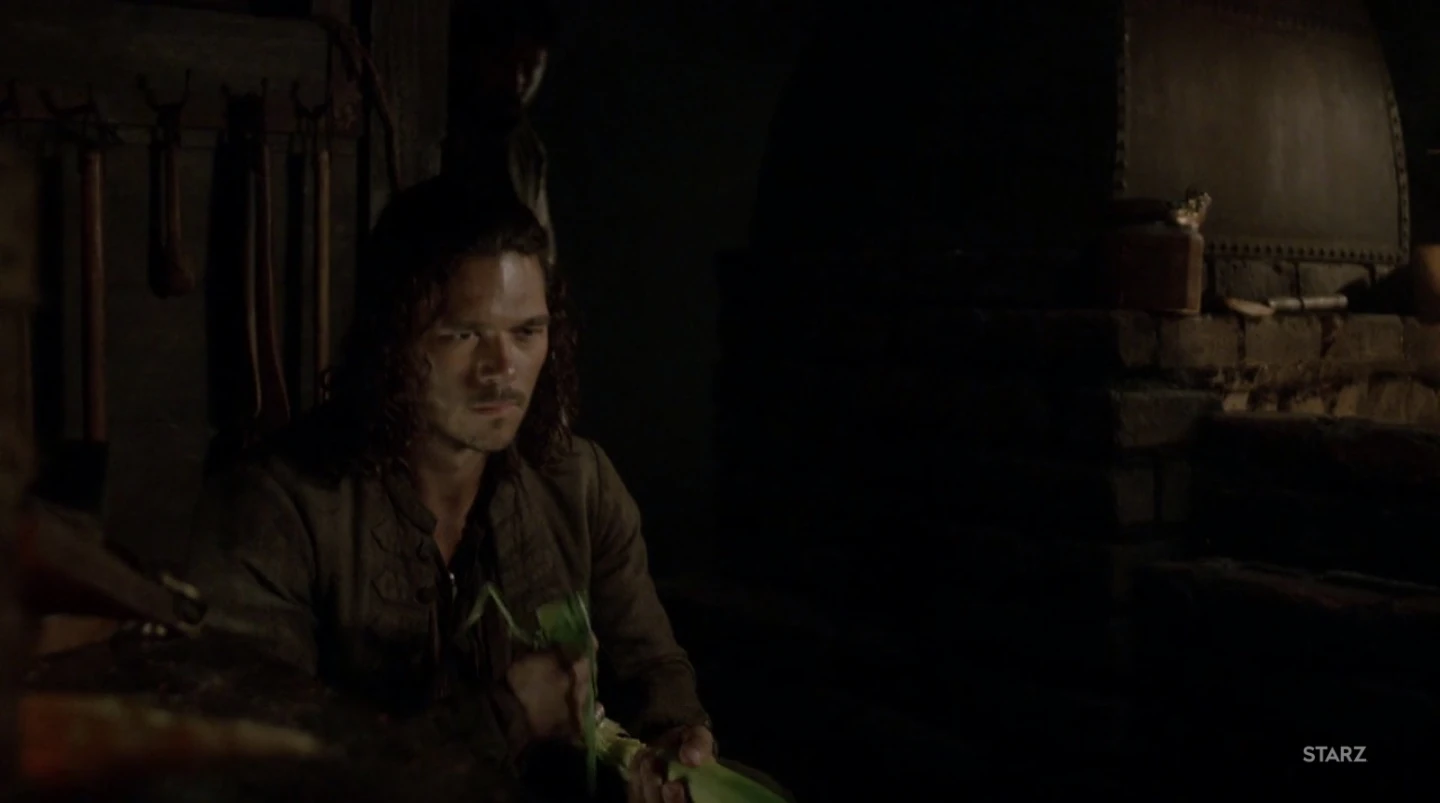 During the infighting between Billy and Flint’s factions of pirates, the New Providence Island Militia arrives. Flint and Madi lead their men to retreat into the corn fields to escape.