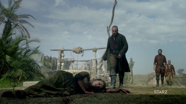 Afterwards, the fortress is sealed and silent. Eventually, Rackham and Featherstone batter the door down, and find it abandoned, save for the crucified corpse of Eleanor’s father, Richard Guthrie. The note pinned to his body states that Vane intends to track Flint to Charles Town, and take the Man O’ War he demanded for Abigail.