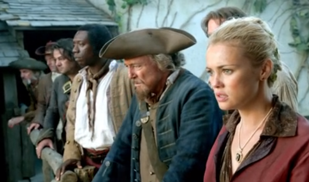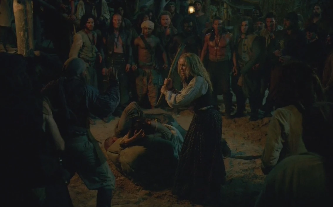 Later, Vane boards Captain Low’s ship under the pretext of offering a partnership. Low quickly sees through the subterfuge, and the two begin a fight below decks, whilst above decks Vane’s crew is silently killing Low’s crew. Vane comes out on top of the fight, and places his head on a stake on the beach as a warning. After seeing Low’s head, Eleanor goes to Vane in the fort, and the two make love. When they are finished, Vane shows Eleanor the “valuable cargo”, Abigail Ashe the daughter of Peter Ashe, the governor of the Carolina.