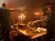 Meanwhile, Captain Flint is making good on his attempt to get Richard Guthrie to duplicate the schedule. With the Walrus's Boatswain, Billy Bones, accompanying him, Flint arrives at Guthrie's mansion and requests an audience with Guthrie. At the meeting with Guthrie, Flint tells him about his desire to capture the Urca de Lima and about his pursuit of the missing schedule. When he asks Guthrie to introduce him to his Spanish contacts so he can recreate the schedule, Guthrie refuses, stating that the risks are far too high to get involved. Flint attempts to physically coerce Guthrie into giving up the name of his Spanish contact in Havana, but before he succeeds he is interrupted by several members of the British Royal Navy, led by Captain Hume of the Scarborough. When confronted by Hume, Guthrie pretends that Flint and Bones are just sugar merchants. Hume, who suspects that Guthrie is running a black market alongside pirates, sees through this ruse and orders that they all be arrested. Flint and Bones attack Hume and his crew, disabling them. However, during the mêlée Guthrie is shot in the shoulder and has fallen unconscious. Flint decides it is best to take Guthrie with them back to the Walrus. As they approach the Walrus, Bones expresses some apprehension toward Flint's leadership. Flint tells Bones that they are going to need to rally behind him because he can get them through the war that is coming, not someone like Singleton. When Bones responds that they are not at war with anyone, Flint states that they are about to be at war with all of civilization. Before they reach the ship, Flint stripes Guthrie of his clothes and wig, hoping to disguise Guthrie's identity since no member of the crew has ever actually seen Guthrie in person.
