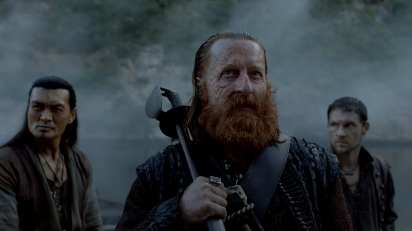 Hands, Silver and Flint rush to the beach to help their men escape the soldiers and flee into the jungle. Rogers calls off his men after the Lion is spotted sailing up the inlet. Hands and the rest of the survivors are picked by Jack Rackham and Augustus Featherstone. After Rackham meets with Flint and Silver, they resolve to rescue Madi, defeat Rogers, and then the cache will be unburied and the war will resume. As the Lion clears the river mouth, they are set upon by the Eurydice, which rams them. The Redcoats line the rails of the ship and begin firing muskets down at the pirates, who can only take cover as they are powerless to fight back. However, Flint is able to cut a line pinning down their mast, allowing their ship to drift alongside the Eurydice. Rackham leads the pirates in boarding the British ship, and a brutal fight ensues on deck, during which Hands kills his fair share of Redcoats. The pirates prevail, capturing Rogers and his surviving men surrender. Silver, Rackham and Flint then agree that Featherstone will ferry Madi back to the Maroon Camp aboard the Eurydice, and Rackham will stay aboard the Lion while Flint and Silver go to dig up the cache.