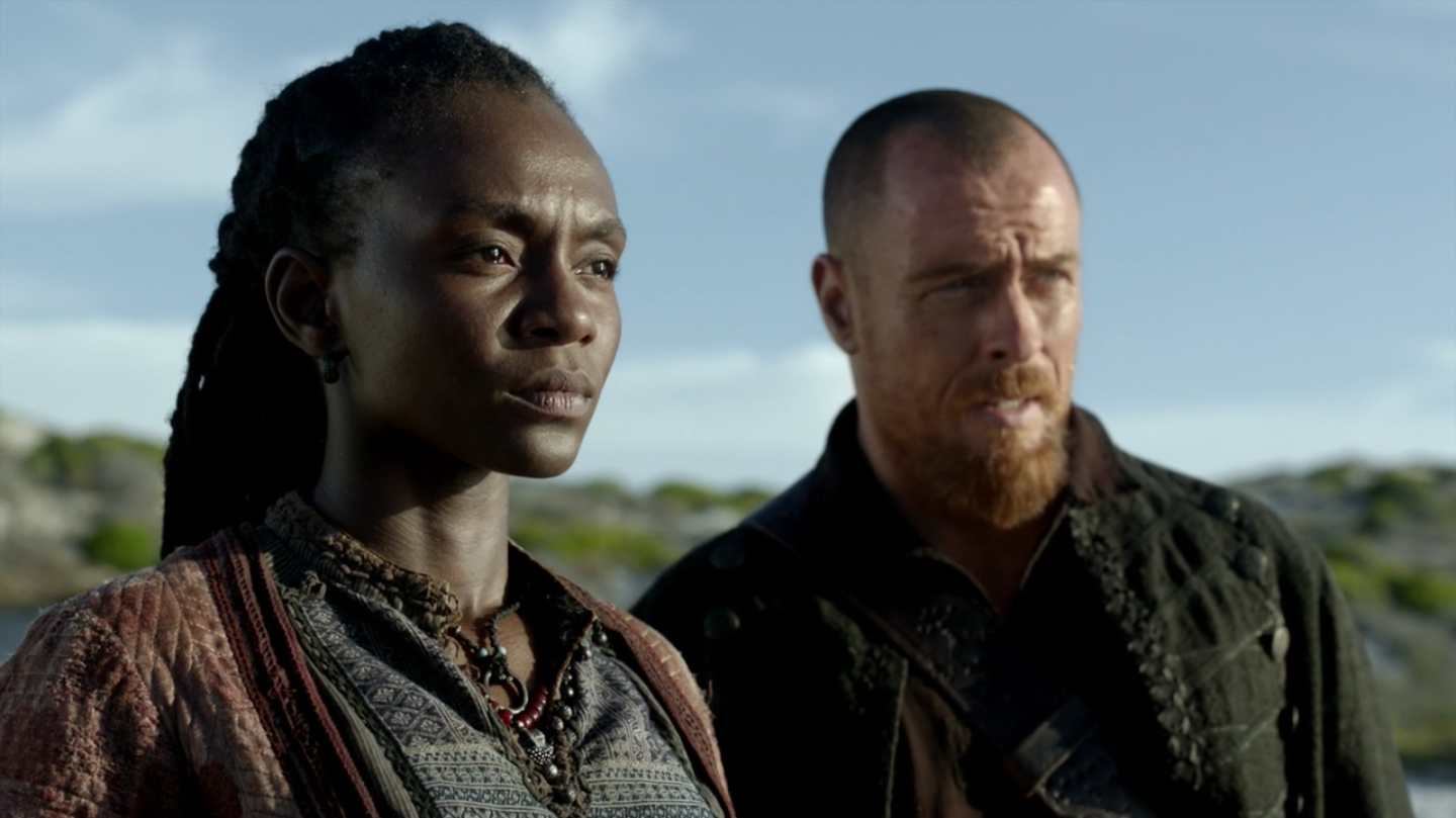 Silver learns from Dooley that Dobbs severely attacked Chidi, one of Madi’s men, in retaliation for killing several of the crew back on Maroon Island before the partnership was agreed. Silver, at an impasse as to how to proceed without tearing their alliance apart, eventually brings Madi into the fold. Madi swallows her pride to maintain the alliance, and releases the man with orders to say nothing, and the story will be that Kofi beat him for speaking impertinently to Madi. Later, while the crew eats on deck, Madi expresses how difficult it was to tell her childhood friend that he had to accept what was done to him by a man who looks just like those who murdered his parents. She promises to fight the anger rising inside her telling her to let her men loose on the pirates. Silver promises that it will not happen again, and they vow to move forward. In order to chastise Dobbs, he has the vanguard pin Dobbs in his bunk with a blanket and beat him. Shortly after, Hornigold is spotted sailing after them, and Silver orders that they rush to retrieve the shore party and flee to the Maroon Island[5].