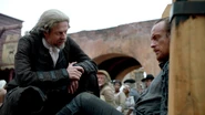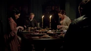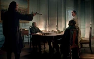 In the Governor’s Mansion, Kensington and Ashe read over the diary. Ashe, despairing, asks if there is any way to keep it out of the record. Kensington says he could just throw it into the fire, but says that it is unwise given that it was produced in front of Ashe’s entire constituency. Kensington tells Ashe that he is the protector of the law in Charles Town and he brazenly disregards that at his own peril. Ashe says that all it takes is one juror to be seduced by the scandal of it all and Flint goes free. Kensington says that Flint isn’t going anywhere. While the diary might may the next few months unpleasant for Ashe, it will not affect the outcome of Flint’s trial, not with the jury they have impaneled. Once Flint is hanged, they will move on to Vane.