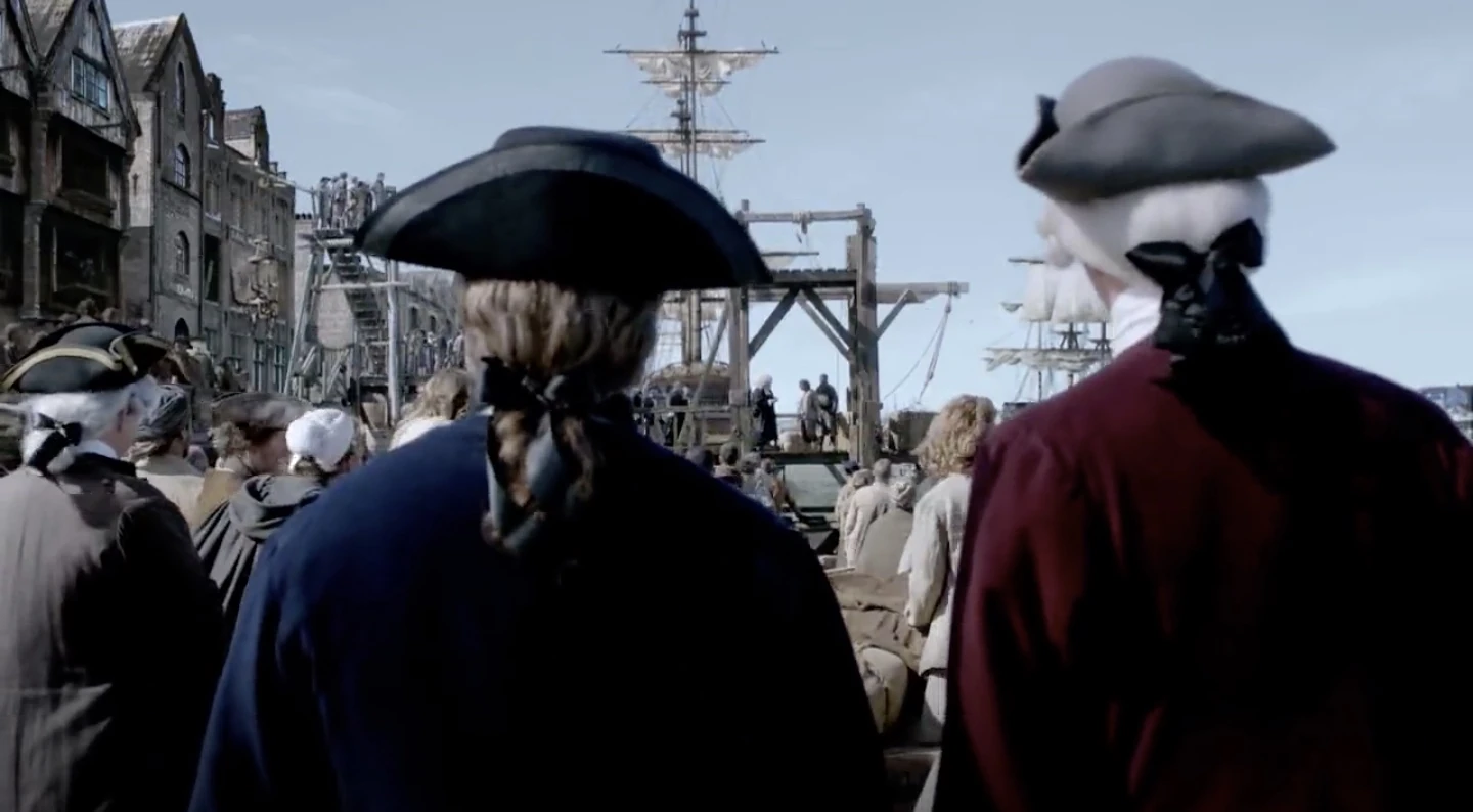 In a flashback to 1705, Lieutenant James McGraw takes Lord Thomas Hamilton to the hanging of a pirate in Wapping. McGraw asks if Hamilton has ever seen a hanging and Hamilton says he has not. McGraw explains the pirate is named Davey, and is accused of high seas piracy, treason, the same charges as the last person to be hanged there and the same as the next. The pirate is asked if he wants to confess and repent in the eyes of God and Queen Anne. The pirate responds by shouting "suck my cock" at the crowd. Hamilton assumes he is supposed to glean from this that the pirates of New Providence Island are incorrigible and dedicated to mayhem and Hamilton's endeavor to reform them is doomed from the beginning. McGraw tells him it isn't the pirate he wants Hamilton to watch, it's the cheering crowd.