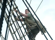 In the harbor at Charles Town, Billy Bones asks for volunteers among the riggers to repair the top sail footrope that killed Nicholas. When no one volunteers, Bones goes up the rigging to repair the footrope himself. As John Silver and Vincent look on, Silver asks Vincent if there is any way that Bones will discover Vincent's sabotage of the rope. Vincent tells him that it is unlikely. Elsewhere on the ship, Dooley tells Mr. Scott he thinks he sees something moving out in the marsh. Scott tells him to keep an eye on it.