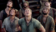 Back aboard Flint's ship, Silver and Vincent continue to hide below decks. Silver tells Vincent that they are in a tight spot, either be killed by Vane's crew or swim to the beach and risk being hanged as pirates.