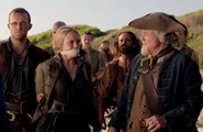 In Mrs. Barlow's house, Eleanor is concluding her business with Underhill when she is confronted outside by Benjamin Hornigold and Dufresne who take her prisoner. They deliver her to Captain Hume and request the ten pardons that Hume promised to Bones if Bones were to deliver Flint. Hornigold tells Hume what a terrific prize Eleanor will make when he takes her back to London, as she is responsible for brokering all the illegal pirate trade in Nassau. Hume throws the pardons on the beach for Hornigold and the men and takes Eleanor captive.