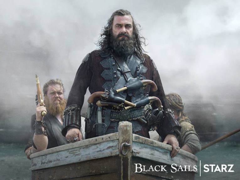 Back at sea, Rogers has Blackbeard strung up by the ankles over the side of the ship. While Rackham, Bonny, and the crew look on, Teach is callously keelhauled, dragging him under the ship covered with razor sharp barnacles. After the first pass, he’s so bloodied and scraped. The second pass sees Teach apparently dead, as his entire body is flayed, but not so; he coughs up sea water. Everyone looks on as Blackbeard’s brutalised body is dragged from the water for a third time; miraculously still alive. Woodes grand moment has been ruined, and he petulantly shoots him in the head at point blank. Rackham has been spared, as he was to be next in line.