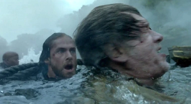 Back on the Walrus, Silver's plan always seemed rather foolhardy, as it relied on Rogers keeping his word and not murdering everyone regardless. Under the cover of the island’s thick fog, Rogers has a few of his redcoats swim out and set the Walrus on fire. Mr. DeGroot, unable to put out the flames, orders the men to abandon ship. With the pirates bobbing in the water, longboats filled with redcoats begin picking them off like fish in a barrel. DeGroot himself is shot in the head. The thing that hurts most is that Billy leads the redcoats. When he locks eye with Ben Gunn, in a brief moment of humanity he lets him go.